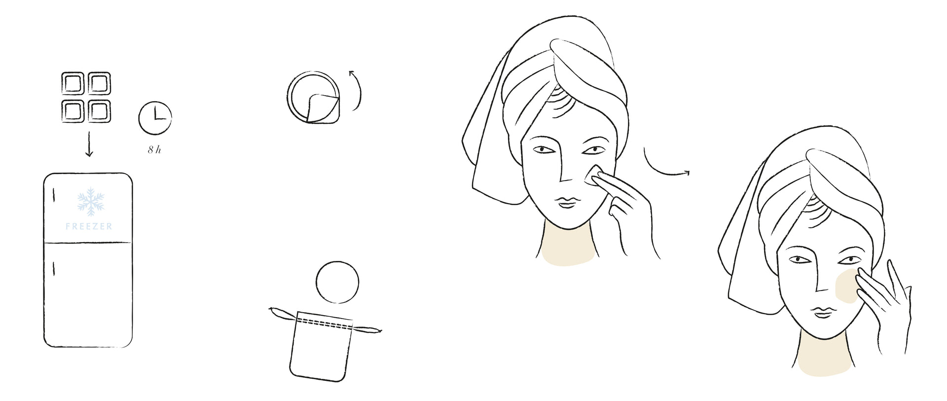 Store the ice cubes in the freezer for a minimum of three hours. When ready to use, remove one cube from its mould and place it inside the gauze sachet provided. Gently glide over the face, neck, décolleté or hands in slow, sweeping motions.